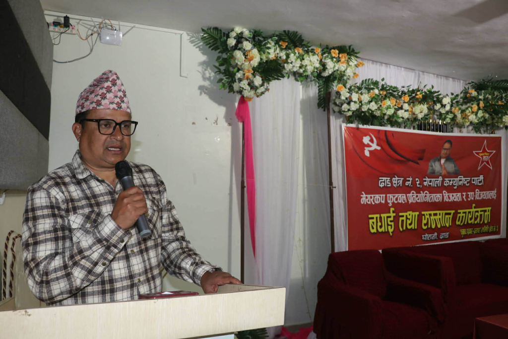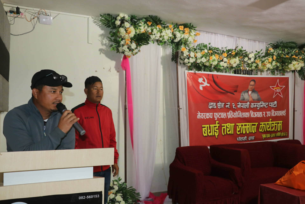 घोराही–नेपाली कम्युनिस्ट पार्टी (नेकपा) दाङ निर्वाचन क्षेत्र नम्बर–२ का उम्मेदवार निर्मल आचार्यले आठौँ घोराही मेयर रनिङकप फुटबल प्रतियोगिताका विजेता र उपविजेता टिमका खेलाडीलाई बधाई तथा सम्मान गर्नुभएको छ।